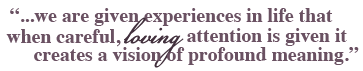 | I truly believe that we are given experiences that can create a vision of profound meaning and when careful and loving attention is paid to these experiences it can open a path to one's true calling.