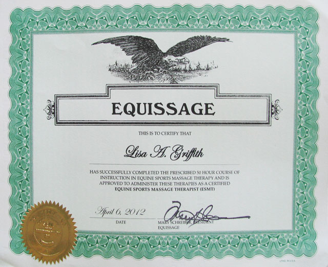 I was trained in Virginia at the home of Equissage and the program included a one week "hands on" intensive course coupled with audio teaching, lots of ongoing reading material, and culminated in a written as well as a hands on exam. In order to be an effective therapist, I feel that it is imperative to get trained through a hands on program with a skilled professional who offers extensive knowledge and experience. The founder of Equissage, Mary Schreiber, fills that bill! She has also become a dear friend and she is available to me and all her trainees for consultation